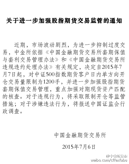 北京7月6日讯 中金所今日晚间发布通知,进一步加强股指期货交易监管。通知称,自2015年7月7日起,对中证500指数期货客户日内单方向开仓交易量限制为1200手。