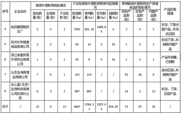 据统计,上述企业自检发现不合格银杏叶提取物原料共4847公斤,目前已封存原料2257.02公斤,销毁原料805.67公斤,其他1784.31公斤原料已使用。8家银杏叶提取物原料自检不合格企业中,5家企业检验发现25批次质量存在问题产品。其中: