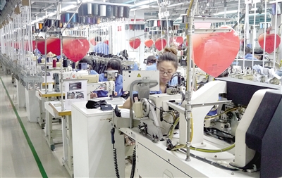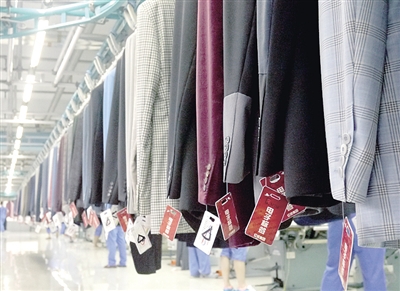 下图 红领集团流水线上的每一件西装都根据客户需求量身定制,每件衣服上都有一个电子标签,囊括全部个性化定制信息。经济日报记者 潘笑天摄