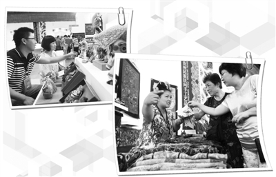 ①②日前,游客在北京798艺术区参观、挑选贵州民族民间手工艺品。 经济日报记者 赵 晶摄
