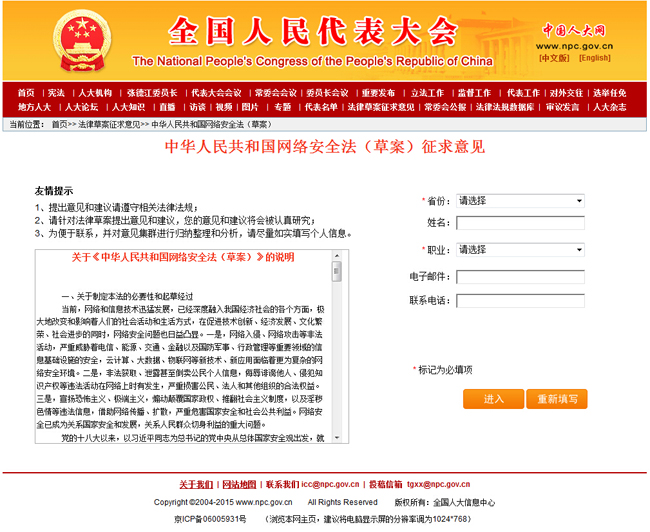 网络安全法草案7月6日起在中国人大网上全文公布,并向社会公开征求意见。