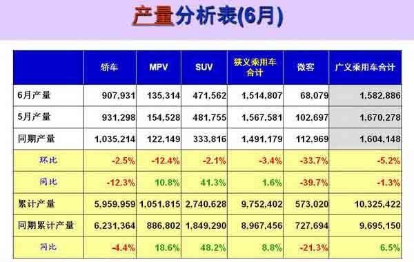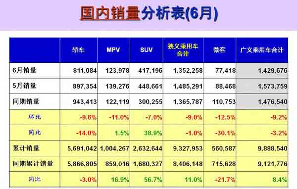 中国经济网6月9日讯(记者 谢源)据全国乘用车市场信息联席会昨日发布的乘用车产销数据,6月车市表现仍持续下滑。6月全国乘用车累计销量142.97万辆,同比出现1%的负增长。在分类车型中,轿车销量81.1万辆,同比下降14%;SUV销量41.7万辆,同比增长38.9%;MPV销量12.4万辆,同比增长1.5%。