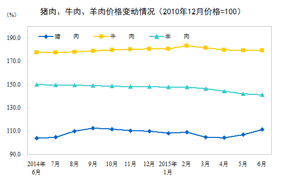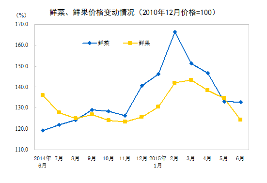 2015年6月份,全国居民消费价格总水平同比上涨1.4%。其中,城市上涨1.4%,农村上涨1.2%;食品价格上涨1.9%,非食品价格上涨1.2%;消费品价格上涨1.1%,服务价格上涨2.2%。上半年,全国居民消费价格总水平比去年同期上涨1.3%。