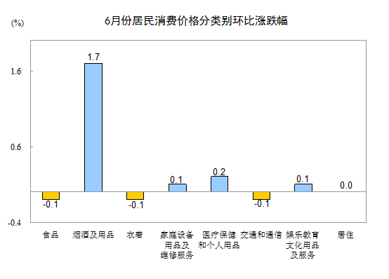 6月份,非食品价格环比上涨0.1%。烟酒及用品、医疗保健和个人用品、家庭设备用品及维修服务、娱乐教育文化用品及服务价格分别上涨1.7%、0.2%、0.1%和0.1%;衣着、交通和通信价格均下降0.1%;居住价格持平。