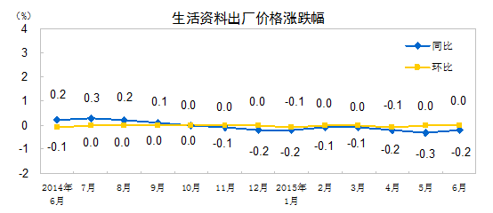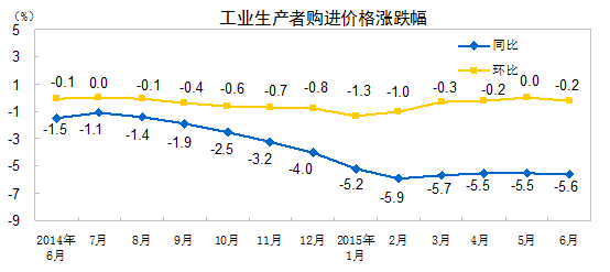 2015年6月份,全国工业生产者出厂价格环比下降0.4%,同比下降4.8%。工业生产者购进价格环比下降0.2%,同比下降5.6%。上半年,工业生产者出厂价格同比下降4.6%,工业生产者购进价格同比下降5.5%。