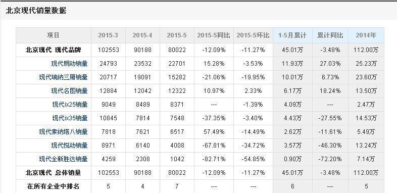 受整体车市放缓的影响,2015年以来,北京现代销售成绩不理想。从数据上看,今年连续几个月整体销量下降明显,由3月的10万辆,降至6月的6万辆。1-5月的累计销量同比下降了3.48%,6月更是被竞争对手长安福特超越,排名降至第八。除了朗动、瑞纳三厢和名图有所增长以外,其它车型销量都呈现下滑趋势。其中SUV车型新胜达5月销量仅为1042辆,同比下降竟达82.71%,边缘化趋势明显。