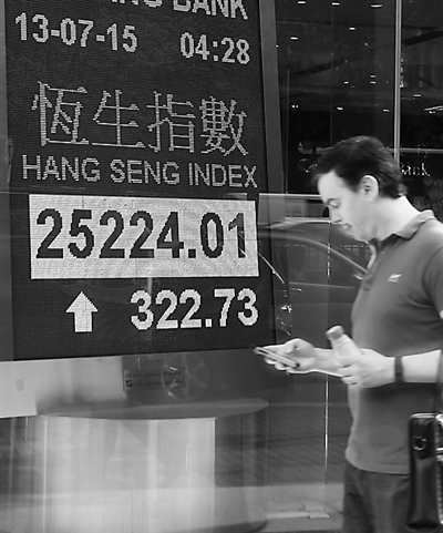 7月13日,香港恒生指数上涨322.73点,收报25224.01点,涨幅1.3%。图为一名行人从湾仔一家银行的恒生指数电子显示屏前走过。