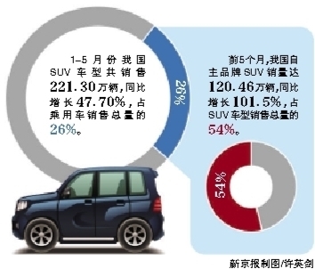 1-5月份我国SUV车型共销售221.30万辆,同比增长47.70%,占乘用车销售总量的26%。其中,我国自主品牌SUV销量达 120.46万辆,同比增长101.5%,占SUV车型销售总量的54%。在此种环境下,今年上半年,我国20个自主品牌推出了27款SUV车型,占到上半年新车总数的38%。而下半年,吉利、比亚迪、东风风神、众泰等13家自主品牌将推出20款SUV车型。我国今年全年SUV上市新车将达到47款,将超过轿车的新车发布数量。