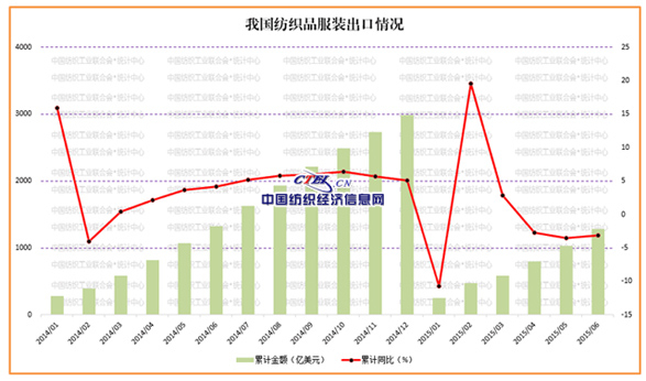 以人民币计价,2015年1-6月我国纺织品服装出口7869.07亿元,同比下降3.13%,其中纺织品出口3243.79亿元,同比下降0.7%,服装出口4625.68亿元,同比下降4.8%。