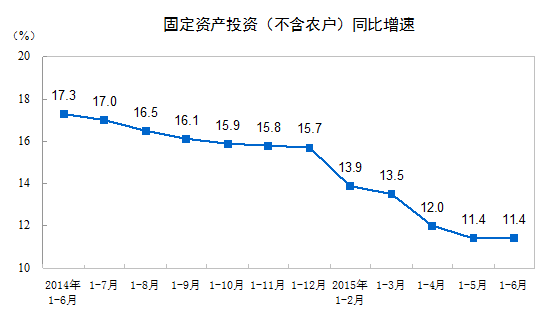 2015年1-6月份,全国固定资产投资(不含农户)237132亿元,同比名义增长11.4%(扣除价格因素实际增长12.5%),增速与1-5月份持平。从环比速度看,6月份固定资产投资(不含农户)增长0.88%。