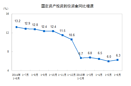 从到位资金情况看,1-6月份,固定资产投资到位资金261507亿元,同比增长6.3%,增速比1-5月份提高0.3个百分点。其中,国家预算资金增长18.6%,增速提高8.3个百分点;国内贷款下降4.8%,降幅缩小1.5个百分点;自筹资金增长8.6%,增速回落1个百分点;利用外资下降30.9%,降幅扩大4.8个百分点;其他资金增长2.4%,增速提高2.3个百分点。