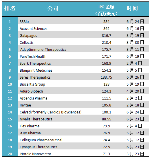 日前,GEN网站发布了2015上半年Top 20 IPO,其中有13家自5月1日起开始交易。据估计,2015年生物医药企业获IPO的数目有望超过去年的63宗。下表是排名前20的IPO详情: