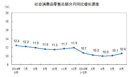 2015年6月份,社会消费品零售总额24280亿元,同比名义增长10.6%(扣除价格因素实际增长10.6%,以下除特殊说明外均为名义增长)。其中,限额以上单位消费品零售额12009亿元,增长7.8%。