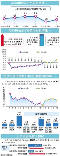 数据显示,北京上半年全市实现地区生产总值1578.3亿元,按可比价格计算,同比增长7%,增速比一季度提高0.2个百分点。