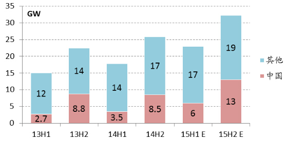 电力工程质量监督总站近期完成了2015年上半年全国在建电力工程规模的数据统计工作,截止5月底,在建光伏发电工程4131.5MW,考虑到我国光伏电站项目周期特性(一般上半年审批、下半年建设),该在建规模预计显著好于往年。