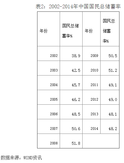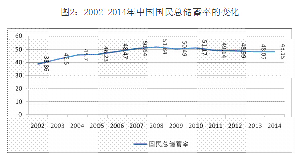2002-2014年,中国国民总储蓄率持续保持在40%以上的较高水平,没有发生明显变化(参见表2、图2)。目前人民币存款余额达132万亿(个人存款余额53万亿),支持经济发展的储蓄和资金供给仍然比较充足。