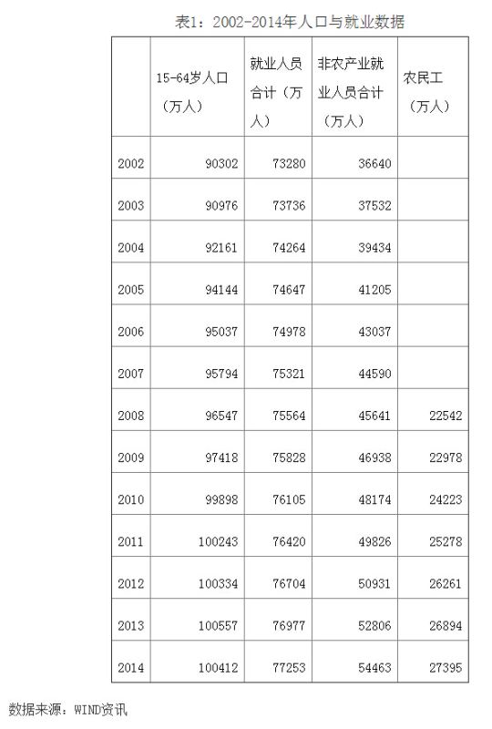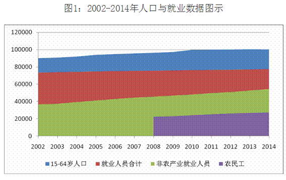 2002年到2013年,中国劳动年龄人口持续保持增长态势,2014年出现减少,但幅度很小(145.6万人),劳动年龄人口总规模持续保持在10亿人以上。与此同时,就业人员总规模持续扩大,非农产业就业规模持续扩大,农民工规模持续扩大;但其总量与劳动年龄人口总量比较差距明显。这表明中国人力资源供给条件没有发生明显改变(参见表1、图1)。总体仍处于劳动力利用不充分状态。