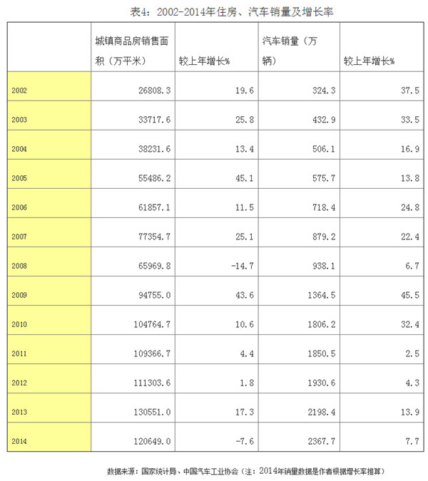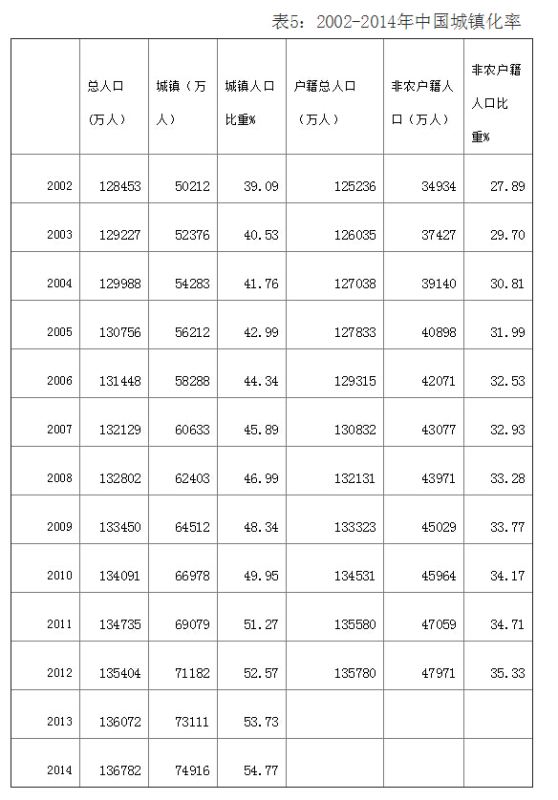 应该注意到,2008年以来,世界经济在结构深刻调整中总体趋稳;我国对外经济转型升级持续推进,稳出口的政策不断完善,今年以来出口增长降中趋稳态势逐渐明显。国内新型城镇化加快推进,正在化解原有大城市主导、低水平扩张城镇化带来的矛盾。城市群作为主体形态,有效拓展着城市的综合承载能力,使人口过度集中于大城市的状态开始改变,原有城镇化模式带来的房地产和汽车发展空间狭窄的矛盾开始趋向缓解。面向未来,中国城镇化潜力巨大。2014年中国按常住人口计算的城镇化率为54.77%(2012年按照户籍人口计算的城镇化率为35.33%)(参见表5),与完成城市化的国家比较(城镇化率一般在80%左右),差距还很大。未来中国的城镇化率必然会持续提高,城镇人口会持续增加,与人口增加特别是户籍人口增加相联系的城镇住房需求将持续增加。随着城市群发展带来的城市体系空间扩大,汽车进入家庭的活动也将持续推进。因此住房和汽车市场仍然有巨大发展空间。还要注意到,到目前为止的住行改善和城镇建设,总体是解决了从无到有的矛盾,而对比发达国家的水平,我们还要完成从有到好的任务,其中蕴含的发展空间更为巨大。综合分析,当前住房、汽车市场调整是与城镇化发展模式转型相联系的阶段性调整,调整后的发展空间仍然非常广阔。今年以来房地产市场销售形势已经明显回暖,房地产企业发展环境趋向改善;与新型城镇化相联系的基础设施建设(城市群内各个城市间的互联互通,城市地下管网补课,各类公共设施等)任务巨大,一带一路开启的全方位对外开放,带来的基础设施互联互通建设任务也明显增加,这些都会推动基础设施投资保持较高增速。综合看,支持投资增长趋稳的因素明显增多了。另一方面,近年来确保民生稳定的政策取得明显效果,经济增速“换档”并未使人民生活水平“换档”,在就业稳定、居民收入增长稳定等因素支持下,消费需求持续平稳增长,成为内需增长的稳定器。