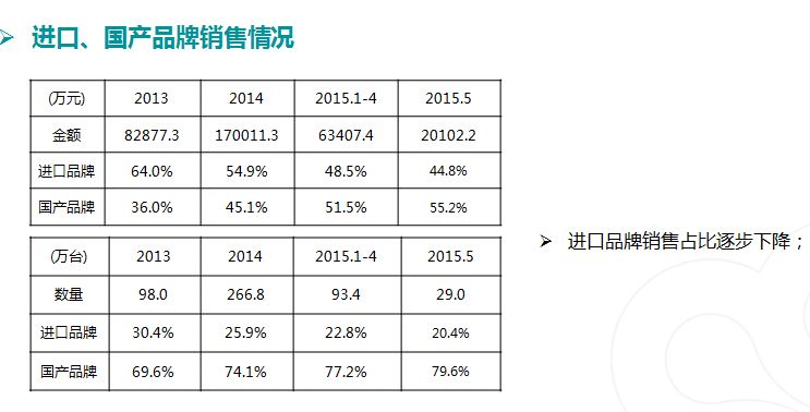 行业数据显示,中国是世界最大的儿童安全座椅生产基地之一,仅安全座椅每年生产量达1000万个,超过90%出口海外,但目前国内儿童安全座椅使用率不到1%。但从中国安全座椅市场近年的总体情况来看,国产品牌的销售占比正在逐年上升,数据魔方的统计显示,2013年国产品牌的销售金额占比为36%,而到了2015年5月,这一数据已经达到55.2%;销售数量上看,2013年,国产品牌销售数量占比为69.6%,而到了2015年5月,这一数据已经达到79.6%。