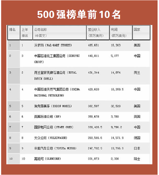 在2015年排行榜前10名,榜单冠军仍旧是去年榜首美国企业沃尔玛,中国企业中石化表现强劲,在榜上排名比去年上升一位,排名超过壳牌石油,成为榜单亚军,荷兰壳牌石油跌至第三位。根据发布的榜单,占据后7位的企业依次为中石油、埃克森美孚、英国石油公司、国家电网公司、大众公司、丰田汽车公司、瑞士嘉能可。