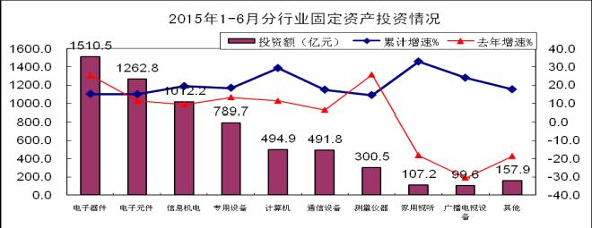 1-6月,电子器件行业完成投资1510.5亿元,同比增长15%,低于1-5月0.2个百分点,低于去年同期10.2个百分点,其中集成电路领域完成投资353.62亿元,同比增长14.5%,比1-5月提高2个百分点;光电子器件领域完成投资1055.96亿元,同比增长18.4%,比1-5月降低1.5个百分点。电子元件行业完成投资1262.9亿元,同比增长14.8%,高于1-5月2个百分点。整机行业中,通信设备行业完成投资491.8亿元,同比增长17.4%,低于1-5月0.9个百分点,电子计算机和家用视听行业投资回升,分别完成投资494.9和107.2亿元,同比增长29.3%和33%,分别高于1-5月4.4和10个百分点。信息材料投资同比增长17.7%,比1-5月提高10.6个百分比,比去年同期提高38.1个百分点。光伏相关行业投资回升,同比增长52%,比1-5月低10.8个百分比,但仍比去年同期提高55.2个百分点。