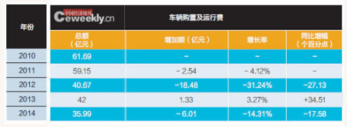 《中国经济周刊》记者统计显示,5年来,“三公”经费之一的车辆购置及运行费由2010年的61.69亿元降至2014年的35.99亿元,削减了25.7亿元,削减额度居三项之首。