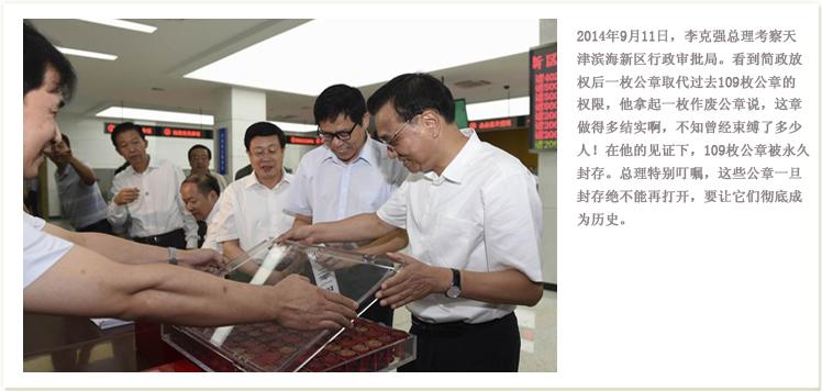 2014年9月11日,李克强总理现场见证了1枚公章取代109枚公章的过程。废弃的109枚公章“被贴上封条永久封存”。这一幕发生在天津滨海新区,这里成立了全国首个“行政审批局”,将分散在18个不同单位的216项审批职责归并到一个部门。