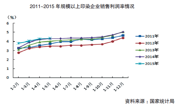 2011~2015年,规模以上印染企业销售利润率保持在3%~5%的水平, 2015年1~5月销售利润率高于前四年同期,较2011年同期增长0.59个百分点。