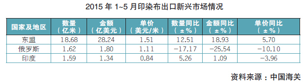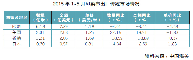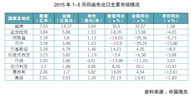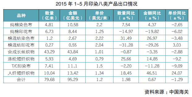 2015年1~5月,印染八大类产品出口数量79.68亿米,同比增长1.98%,增速较2014年同期回落6.11个百分点;出口金额95.29亿美元,同比增长0.67%,增速较2014年同期回落11.25个百分点;出口平均单价1.20美元/米,同比减少1.29%,增速较2014年同期回落4.88个百分点。2015年1~6月,我国服装出口金额754.68亿美元,同比减少4.7%;家纺出口金额156.1亿美元,同比下降1.2%,反映出我国印染布通过纺织品服装等间接出口同比有所减少。
