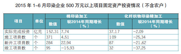 2015年1~6月,印染企业500万元以上项目固定资产实际完成投资189.48亿元,同比增加5.66%,增速较2014年同期回落30.34个百分点。目前企业投资主要用于技术装备提升、环保设施提标改造、产品研究开发等方面。施工项目数480个,同比减少4.19%,增速较2014年同期回落25.79个百分点;新开工项目数371个,同比增加8.48%,增速较2014年同期回落14.1个百分点;竣工项目数127个,同比减少22.56%,增速较2014年同期回落97.03个百分点。新开工项目数、竣工项目数增幅较一季度均有较大幅度回落。其中,棉印染精加工企业的实际完成投资额、施工项目数、新开工项目数及竣工项目数增速均高于化纤织物印染精加工企业。