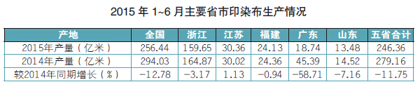 2015年1~6月,规模以上印染企业印染布产量256.44亿米,较2014年同期下降12.78%,产量降幅较一季度10.74%降幅进一步加大。浙江、江苏、福建、广东和山东等东部沿海五省产量246.36亿米,占全国总产量的96.07%,除江苏外,浙江、福建、广东、山东印染布产量较2014年同期都有不同程度减少,其中广东省减少58.71%。