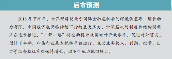 2015上半年,在全球经济整体温和复苏的大环境下,我国印染行业虽面临诸多困难和压力,但行业进一步加快产业结构调整,全行业规模以上企业主营业务收入、利润、固定资产投资及出口等主要经济指标实现增长,增幅较一季度有所回落。