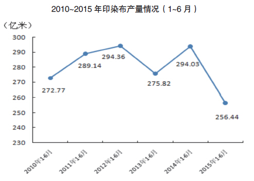 2010~2014年,规模以上印染企业上半年印染布产量,除2013年有所下降外基本呈逐年增加态势。2015年上半年,印染布产量比2014年同期减少37.59亿米,甚至低于2010年同期产量。