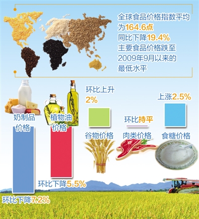 根据通报,7月份全球食品价格指数平均为164.6点,比6月份下降了1%,与去年同期相比,降幅则高达19.4%。粮农组织表示,全球食品价格再创新低的主要原因是奶制品和植物油价格骤降,其跌幅抵消了谷物和食糖价格的小幅提升。