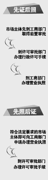 所谓“先照后证”,即从事后置许可经营项目的市场主体,先向工商部门申请办理营业执照,再到许可审批部门办理许可审批手续。这一审批程序的改变是相对于原来的“先证后照”制度而言的。在原有的制度框架下,普通人想要创办公司需要跨越许多“门槛”,其中以注册资本和前置审批最难逾越:首先要有足够的资本,然后还要取得主管部门的行政许可证,才能到工商部门申办营业执照。