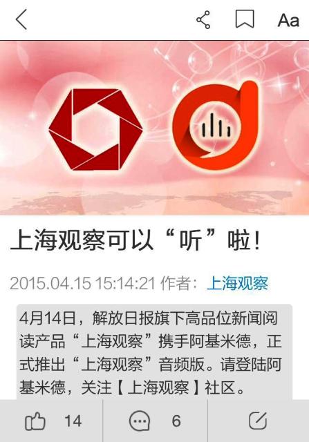 “上海观察”全面音频化。4月14日,“上海观察”社区成功登陆上海广播电台“阿基米德”平台。由“上海观察”主编和编辑们共同录制的15分钟优质新闻评论类内容通过“阿基米德”平台播出,实现了“上海观察”内容的音频化。此后,“上海观察”又与“蜻蜓FM”和“喜马拉雅FM”对接,开设音频栏目,进行社区互动,扩大“上海观察”音频内容的覆盖面。