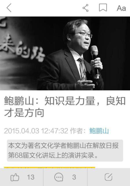 每天,“上海观察”的值班编辑都会做好《解放日报》精彩内容的推荐,这是检验报纸稿件反响的又一重要平台。例如转载的《鲍鹏山:知识是力量,良知才是方向》一文,仅客户端的阅读量就达到25万。特稿《刘翔这十一年》“上海观察”阅读量达5万。