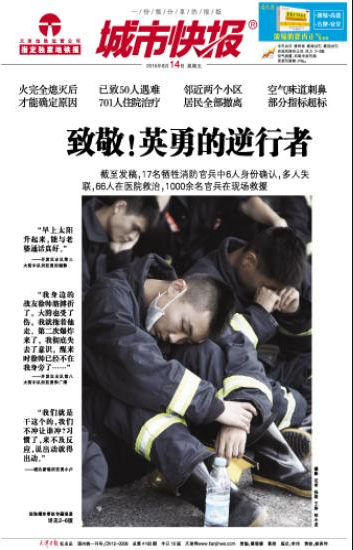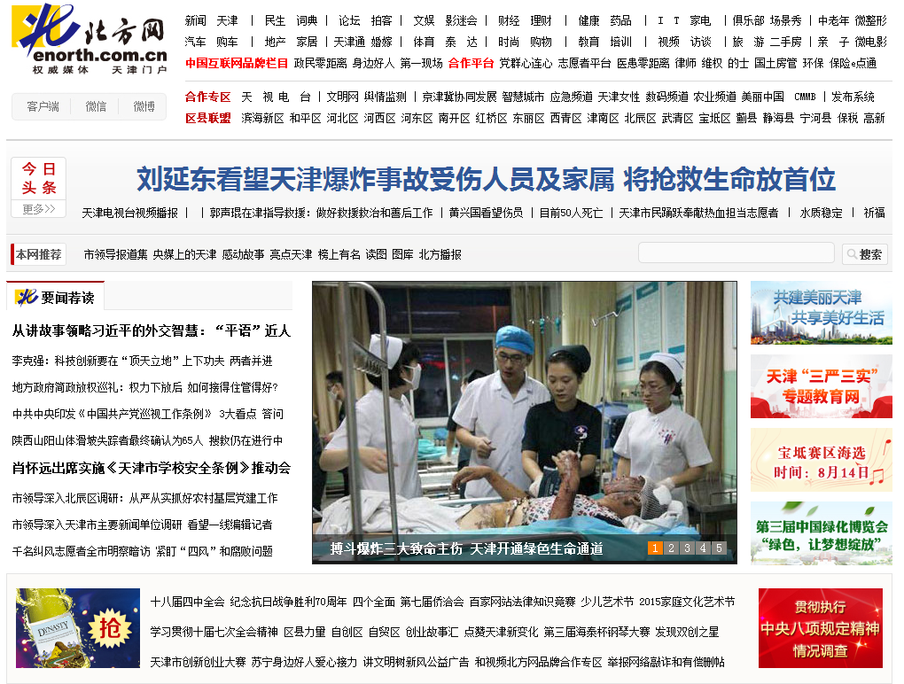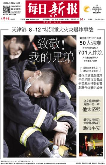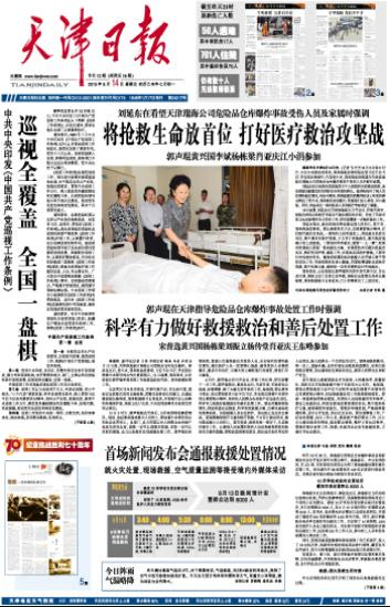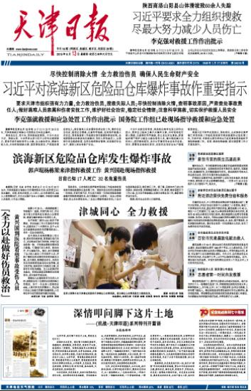 爆炸事故发生几分钟后,《天津日报》立即派出20多位文字记者、摄影记者和新媒体记者,紧急赶赴现场采访参与抢救的消防官兵、医护人员,通过天津日报微信公众号第一个发布了来自爆炸现场的准确消息。《天津日报》总编室及时调整版面,推迟报纸付印时间,在8月13日的头版及时刊登了习近平、李克强等中央领导同志关于天津滨海新区爆炸事故的指示、批示以及各界参与救援的消息。