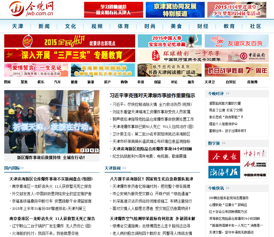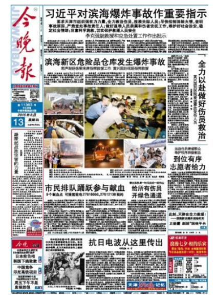 《今晚报》在获悉天津滨海新区发生爆炸事故后,编委会立即决定由副总编辑陈杰带领多名记者赶赴现场采访,一批抢救现场的报道和图片通过今晚报微信公众号迅速发布。13日下午出版的《今晚报》头版、二版几乎两个整版报道了习近平、李克强等中央领导同志对天津滨海新区爆炸事故的指示、批示及天津各界参与救援的消息、通讯,并配发评论《凝聚起战胜灾害的力量》。