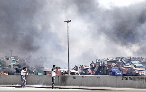 8月13日,《天津日报》视觉中心记者在爆炸事故现场。祁小龙 摄