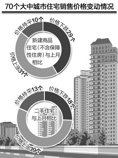 刘建伟说,从上涨城市个数看,新建商品住宅价格环比上涨的城市比上月增加4个,持平的城市比上月增加1个;二手住宅价格环比上涨的城市比上月减少3个,持平的城市比上月增加5个。从涨幅看,7月份70个大中城市新建商品住宅和二手住宅价格环比综合平均涨幅分别比上月回落0.2和0.1个百分点。