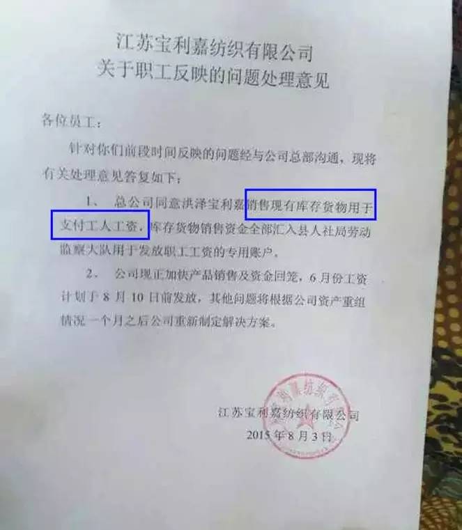 由于宝利嘉的破产倒闭,给政府和广大宝利嘉员工带来了很大的损失,现县政府将会以销售宝利嘉库存产品的方式来支付赔偿员工的损失!6月份工资计划在8月10号前发放!