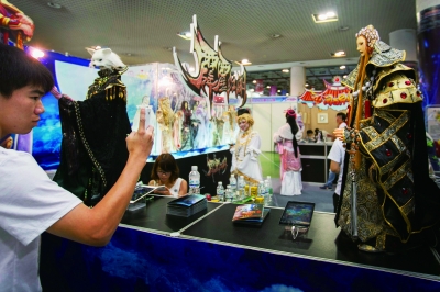 台湾最大游戏公司冠智科技前来参展,展示由风靡台湾数十年的霹雳布袋戏改编的手机游戏等周边产品。 施辰静 摄