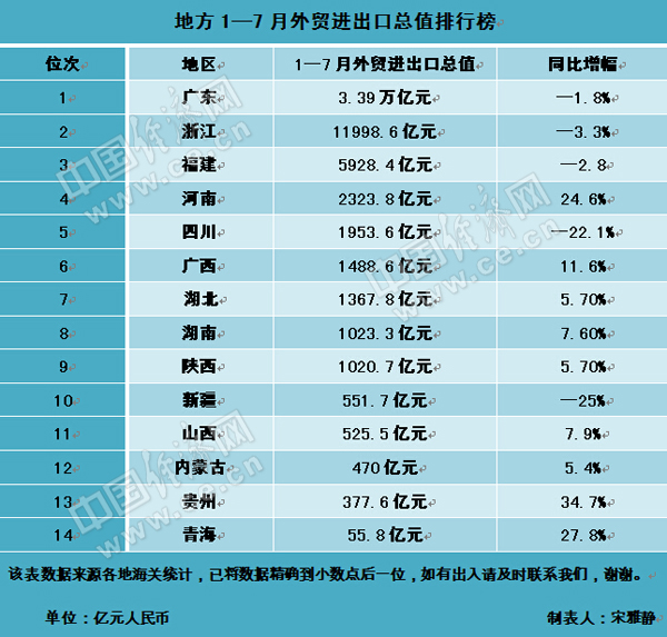 地方1-7月外贸进出口总值排行榜。制表人:宋雅静