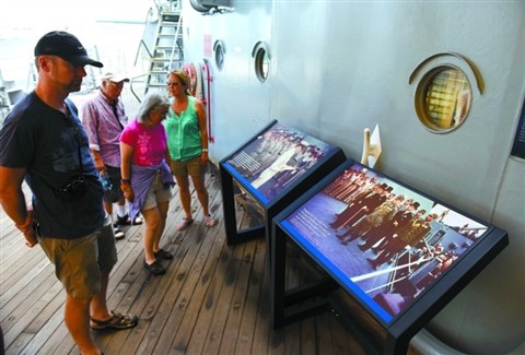 7月30日,在美国夏威夷檀香山珍珠港的“密苏里”号战列舰上,游客观看日本向盟军投降仪式的照片。新华社发