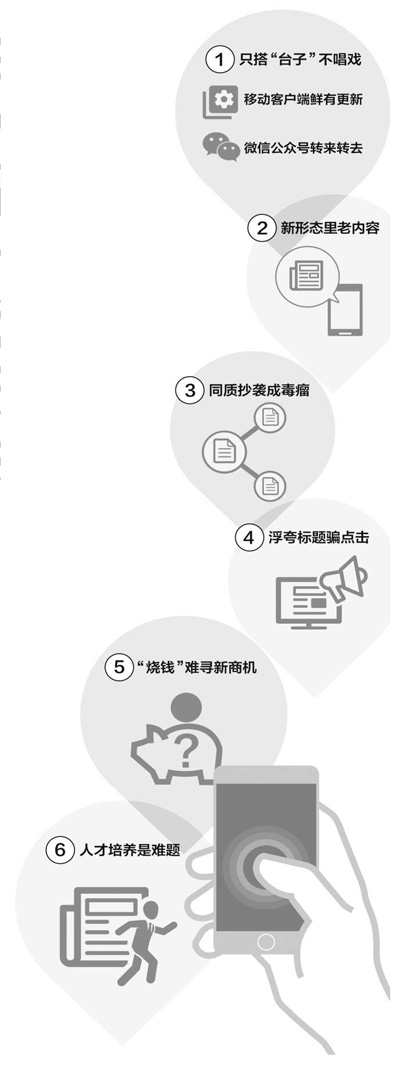 造成这种现象的原因有很多方面。首先是没有“酿新酒”的能力。在媒体转型的过程中,传统媒体受到巨大冲击,但“破而未立”,新媒体发展还不成熟,人员编制、技术支持、财力保障等均投入不足,客观条件限制了发展。