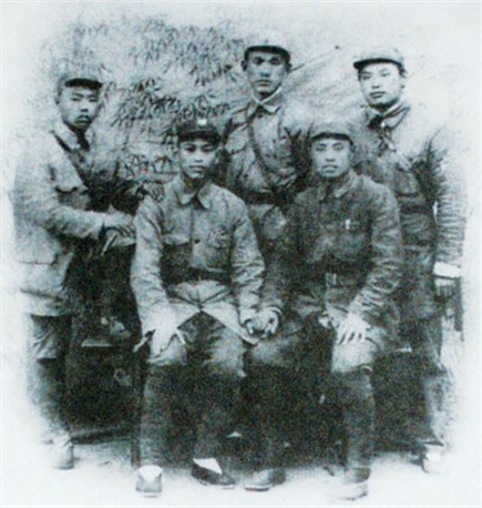 1946年,抗战期间参加革命的刘氏四兄弟与滨海县委书记王琳合影。前排左一为刘庆濂,后排左起为刘庆泗、刘俊峰、刘庆溥。