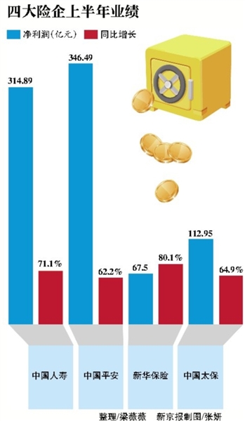 今年上半年,四大上市险企共实现净利润841.83亿元,逼近去年全年的净利润(889.45亿元),同比增长67.15%;四大险企平均日赚约4.68亿元,接近去年(2.44亿元)的两倍。