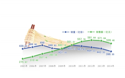 昨天,中国科学技术学会公布的一组统计数据显示:2014年,全国22家方便面企业中有9家销售额下跌,全行业产量下跌10.6%,销售额下跌7.9%。