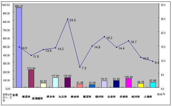 4、各地区发展齐头并进,产业特色明显。从总量看,文化产业主营业务收入超过百亿元的有:南昌市210.84亿元、萍乡市117.61亿元、九江市116.83亿元、宜春市105.49亿元,上述4个设区市主营业务收入合计占全省比重达58%。增速前三位的设区市是:九江同比增长24.5%、赣州增长18.2%、宜春增长16.7%,分别高于全省平均增幅10个、3.7个、2.2个、0.4个百分点。南昌文化产业涉及面最广,其主导产业覆盖文化用品纸张、文具、油墨、颜料等制造和图书报刊发行销售;景德镇发挥陶瓷文化优势,创新发展,打造集创作、展示、旅游、时尚、商贸为一体的国际化陶瓷文化创意服务平台;萍乡和宜春大力发展焰火鞭炮文化,其制作技艺已被文化部确定为“国家级非物质文化遗产”;九江的都昌贝类工艺品、新余的恩达麻艺制造、鹰潭的雕花樟木箱制造、赣州的上犹油画、吉安的吉州窑文化产品开发、抚州的香文化产品制造、上饶的婺源砚台制作等文化产业特色明显。